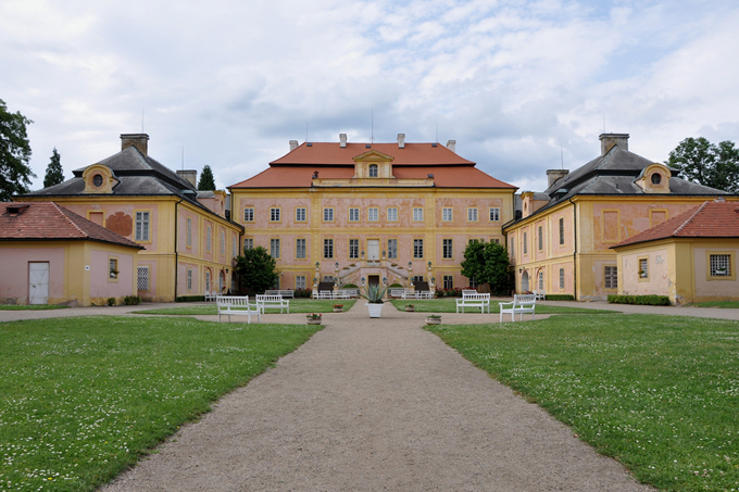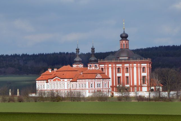 Zámek Valeč s kostelem a sloupem Nejsvětější Trojice leží na úpatí zalesněných Doupovských hor.